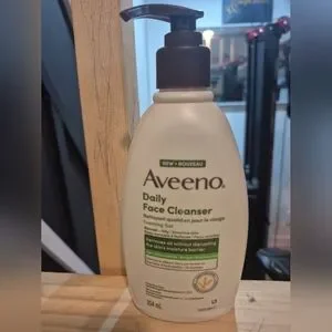 Aveeno Daily Face Cleanser in a white bottle with a brown pump. Gentle formula for daily use. Clear Aveeno branding on front. Simple, natural presentation.