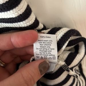 Pre-loved and in great condition. 100% cotton. Cotton knit stripes are textured. Darts in chest area. Hook and eye plus zipper closure. Pleat in front of dress, middle of skirt.