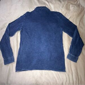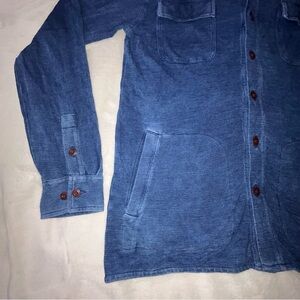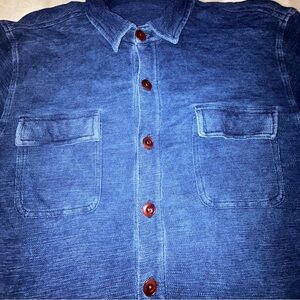 Lightweight indigo shirt jacket by Peter Millar. Button-front closure with contrast buttons. Dual chest patch pockets and two front welt pockets. Soft, washed texture for a casual look. Easy layering piece for everyday wear.