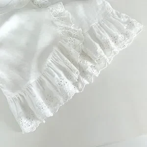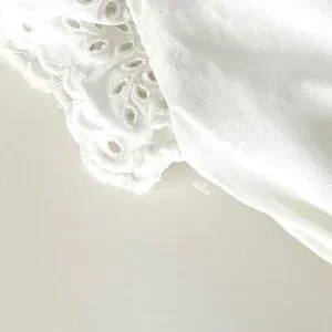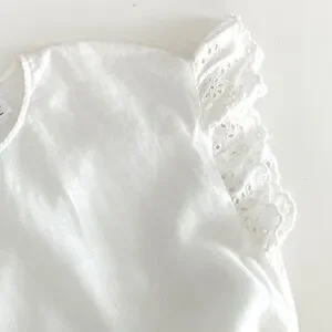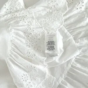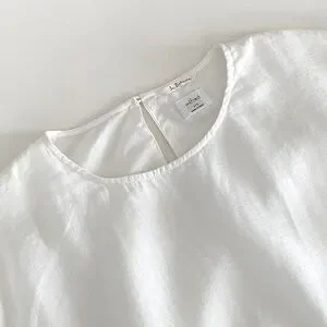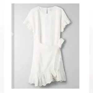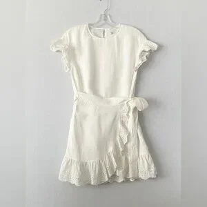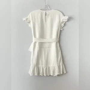 A little flounce goes a long way. This is a short dress with a wide scoop neckline and ruffle details at sleeve cuffs and along the hem. It's made with a softly structured linen that doesn't cling.