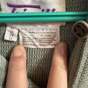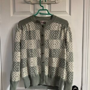 Lightweight cardigan with a sage green and cream geometric pattern. Button-front closure and ribbed cuffs for a polished fit. Versatile layering piece that pairs with skirts or jeans. Soft knit construction for everyday comfort.