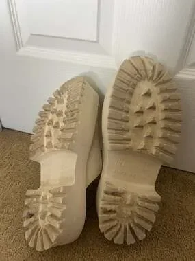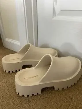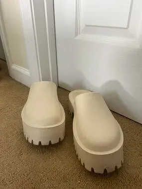 Jeffrey Campbell Clogge Platform Mules in Sea Salt. These trendy platform clogs feature a chunky lug sole and a textured finish in a versatile cream/off-white 'Sea Salt' hue. Perfect for adding height and a modern streetwear edge to any outfit.