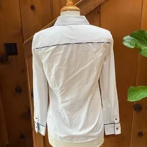 Tie style accent fabric along placket, collar, cuffs, and pocket