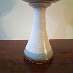 A lovely clay pottery piece handmade by renowned artist Bonnie Staffel. Scenes of palm trees in silhouette across a pastel skyline. A wonderful work of art, likely 1960-1970. Signed on bottom. Please see pictures and video for further details. The video is truest representation of coloration.