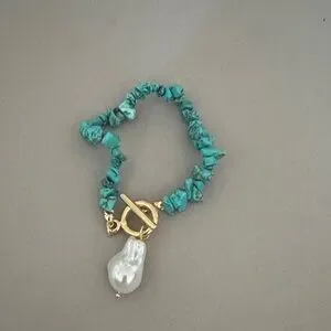 Handcrafted turquoise chip bracelet with a gold-tone toggle clasp and a dangling baroque pearl. Features vibrant turquoise beads for a bold, natural look. Elegant gold accent adds warmth and polish. A versatile accessory for everyday wear and special occasions.