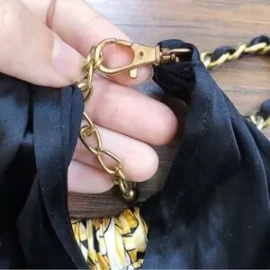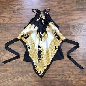 Cache • vintage silk scarf top halter neck chain black white gold versace