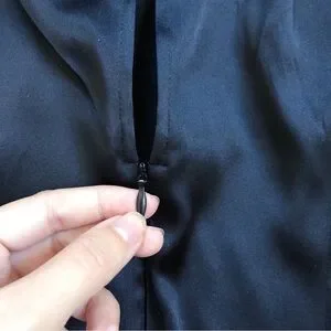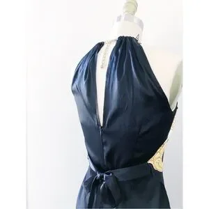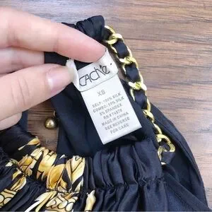 Gorgeous silk blouse by Cache. Halter style ft a triangle scarf layer over a fitted tank with back zip closure. Gorgeous Versace-style baroque scrollwork print in gold, white, and black. Scarf ties at back waist. Adjustable chain & hook closure at back neck. Bust 30-35“, (lots of give due to bias cut) length 23“. Size XS, great vintage condition w minor wear to finish on hook (see photo).