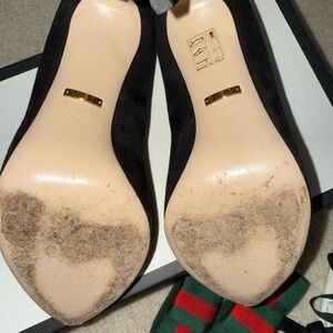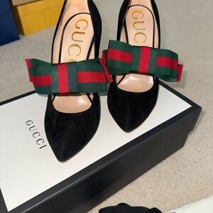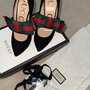 Chic Gucci women's pumps in black suede. Pointed toe with a bold green and red striped ribbon bow. Sleek silhouette for dressy looks. Luxurious leather lining and branded insole. Bow is removable. Comes with box, duster bags and heel replacements.