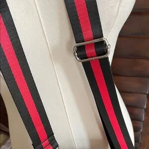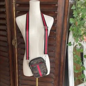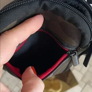 Compact camo crossbody bag with bold red stripe and adjustable black-and-red webbing strap. Front zip pocket and main compartment keep essentials organized. Lightweight, hands-free design ideal for everyday carry. Stylish camouflage and red colorway complements casual looks.
