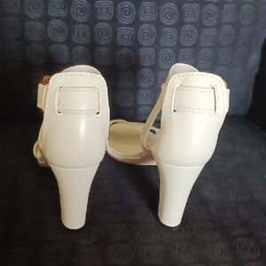 Elegant cream block heels featuring an open toe and supportive ankle strap with buckle. Smooth upper for a refined finish. Stable heel for everyday wear. Neutral hue pairs easily with many looks.
