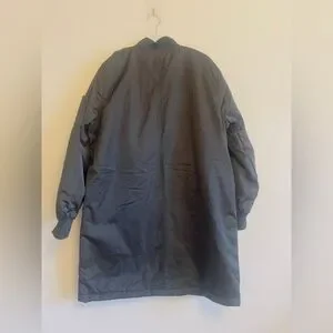 Long black bomber jacket with front pockets. Features a sleek design and zip closure.