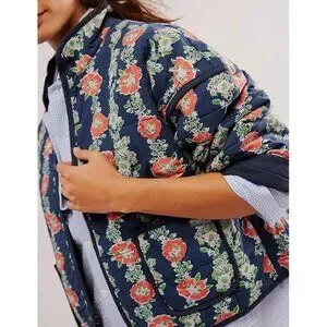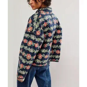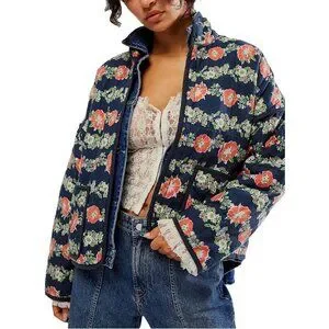 Women’s Navy Cropped Puffer Jacket Floral Printed Quilted Lightweight Coat