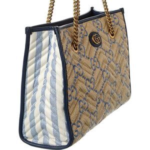 About the brand: Eclectic and coveted. Italian luxury redefined. Made in Italy GG Marmont Medium Raffia & Leather Tote in natural and blue raffia and leather with light fine gold hardware and interlocking G logo Interior design details: microfiber lining, zippered pocket Measures 13.8in wide x 10.6in high x 5in deep Top handles drop 9in Open top with toggle closure Please note: All measurements were taken by hand and are approximate; slight variations may occur. Our products are 100% genuine. In some cases we purchase merchandise from trusted independent suppliers and not directly from the brand owner. In all cases we stand by the authenticity of every product sold on our site.