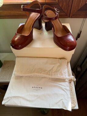 Sezane Mary Jane block heels in rich brown leather. Square toe and adjustable ankle strap. Sturdy mid-height block heel. Smooth leather upper with subtle shine. Timeless, feminine silhouette for day or night.