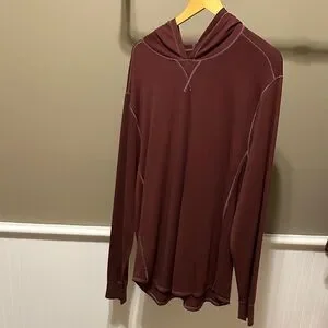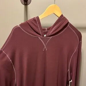 Lightweight maroon hooded pullover with contrast stitching. Soft, breathable fabric for all-day comfort. Versatile layering piece that pairs easily with jeans or joggers. Clean, minimalist design in maroon.