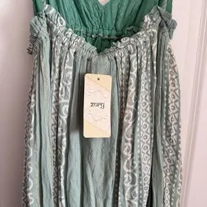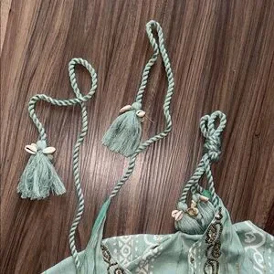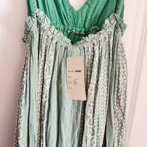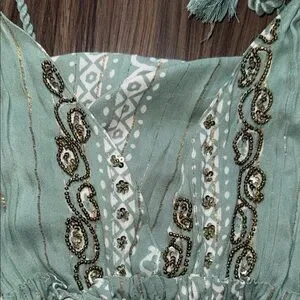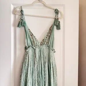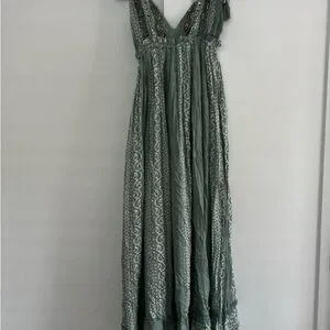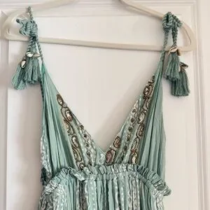 Lightweight boho maxi dress in sage green with delicate embroidery and patterned skirt panels. Adjustable tassel shoulder straps for a custom fit. Soft flowing fabric creates an easy, flattering silhouette. Perfect for warm-weather events and casual outings.
