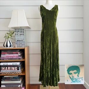 Rare vintage 1980s Betsey Johnson "Punk Label" maxi dress, crafted from crushed/crinkled velvet in an olive green shade.