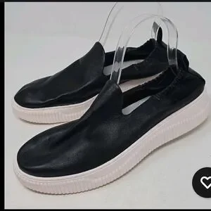 Sofft slip-on flats in smooth black leather. Elasticized back for an easy fit. Thick white platform sole for casual height. Clean, modern silhouette. Comfortable everyday style. size 8M