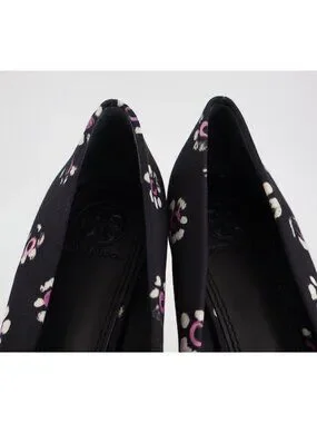 Tory Burch Rosalind Ballet Flats Women's Size 5 Black Floral Satin Bow Pointed