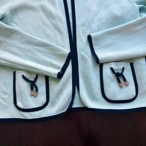 In great condition! Color is a light blue/mint color. Very soft with nice stretch to it. Chic textured knit jacket/cardigan with classic contrast trim.