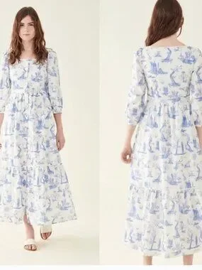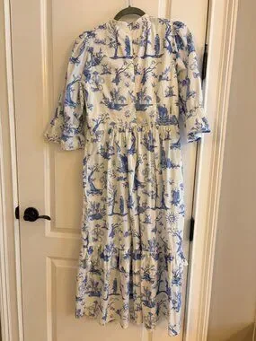 The Meadows blue and white toile dress is a stylish and versatile piece perfect for casual occasions. This floral patterned dress features ruffle accents and a long length, with half sleeves and pockets adding practicality to its design. Made from comfortable cotton material, this dress is easy to care for with machine washable instructions. In a size US 2, this dress is ideal for the spring and summer seasons, making it a must-have addition to any woman's wardrobe.