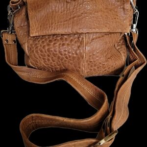 Stylish textured Daniella Lehavi crossbody with flap closure. Removable wide shoulder strap. Soft pebbled leather-look exterior. Versatile everyday design.