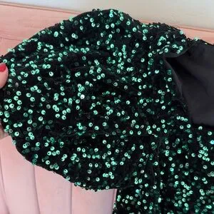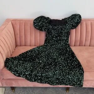 Shimmering black dress with scattered green sequins. Puff short sleeves and a fitted bodice. Flared skirt creates graceful movement. Elegant neckline and smooth back closure.