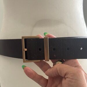 Classic black leather belt. Gold-tone square buckle and keeper. Simple, versatile style. Great for everyday wear.