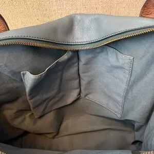 Sleek blue leather tote with brown shoulder straps. Front zip pocket and leather pull tab. Gold-tone hardware accent. Smooth pebbled texture. Roomy interior for daily essentials. Measures 17”x13”.