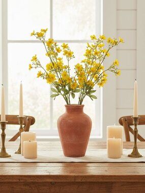 The warm yellow tone instantly brightens neutral interiors and pairs beautifully with both spring and summer décor. Accented with soft green foliage and natural branching, these stems create a realistic, full look whether styled alone or mixed into a larger arrangement.