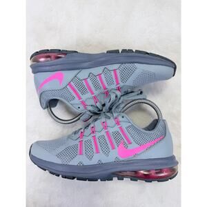 Nike Air Max Dynasty women’s running shoes in Blue / Grey / Hyper Pink colorway (816748-401), size 7.5. Lightweight running sneakers designed for comfort featuring breathable mesh uppers, visible Air Max cushioning, and durable rubber outsole for traction. Ideal for running, walking, gym workouts, or everyday wear.