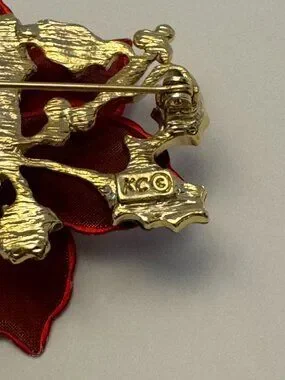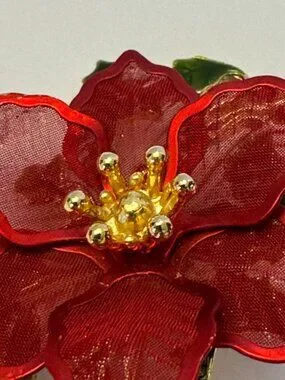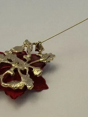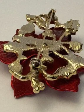 A beautifully crafted vintage brooch featuring a vibrant red poinsettia with gold-tone accents, offering a timeless accessory for elegant attire.