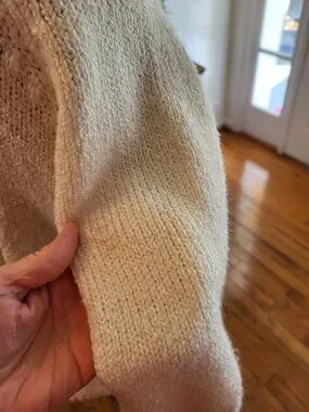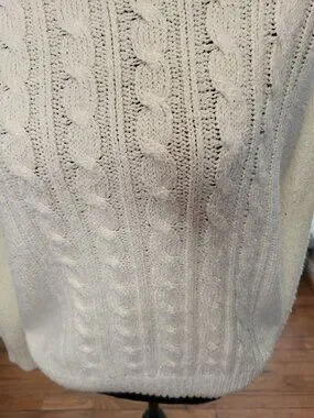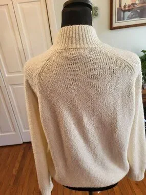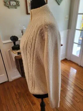 Vintage 90s ivory mock neck sweater by Karen Scott features relaxed fit, mock neck, cable knit design, and pearl buttons. Sweater is made from acrylic but feels soft to the touch.