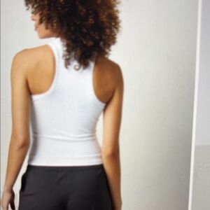 Sleek high-neck tank with a fitted ribbed silhouette. Stretchy, soft fabric for comfortable wear. Minimal, versatile design that layers easily. Clean white tone for a fresh look.