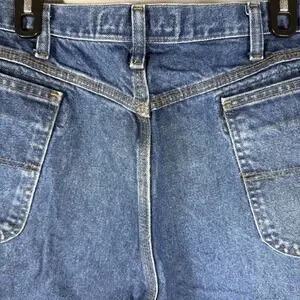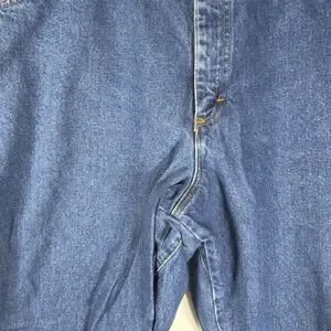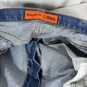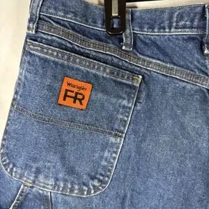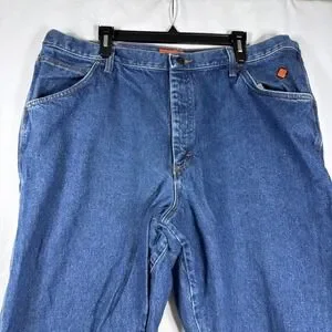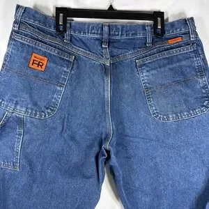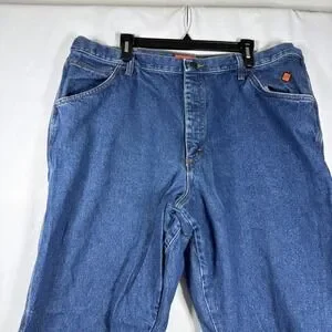 The Wrangler FR Riggs Workwear Jeans Mens 42x32 Flame Resistant Carpenter FR3W020 are a pair of durable and protective denim jeans designed for men in a solid blue color. Made with fire-resistant cotton fabric, these relaxed fit jeans feature a zip closure and multiple pockets for convenience. With a straight leg style and a 32-inch inseam, these Wrangler jeans are perfect for tough jobs that require both safety and functionality. The medium wash and regular size make them a versatile option for everyday wear.