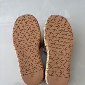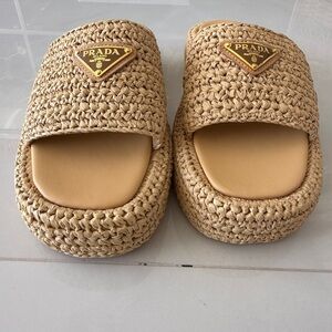 Raffia-woven slide sandals by Prada. I’ve never worn these, so they’re brand new - they were gifted to me by a friend and they’re just not my style.