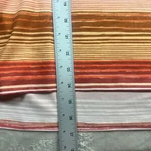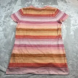 NWT L.L.Bean Everyday SunSmart Knit Tee features a vibrant multi-color horizontal stripe pattern in shades of orange, pink, and brown. Designed for active outdoor use, this short-sleeve top provides UPF 50+ sun protection and is crafted from a moisture-wicking blend of polyester, lyocell, and elastane for cool, dry comfort. The shirt includes a classic crew neckline and a slightly dropped rear hem for extra coverage.
