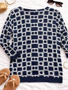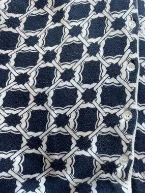 Effortlessly chic and versatile 🤍 This navy and white cardigan features a timeless geometric chain-link print that adds a polished, elevated feel to any outfit. The lightweight knit and classic button-front design make it perfect for layering year-round.