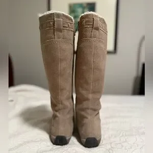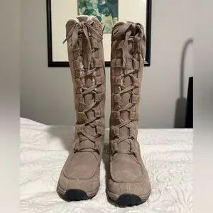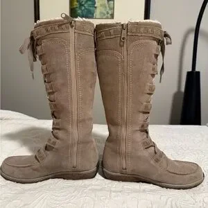 Stylish and versatile women's tan suede lace-up/zippered tall waterproof boots. Perfect for those cold snowy days.