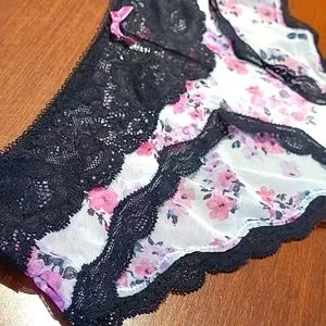Color is white with pink floral pattern and black lace.