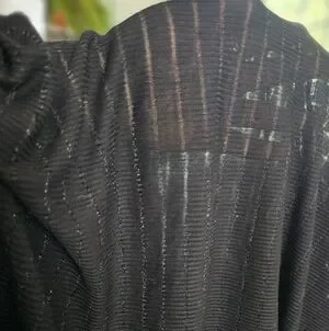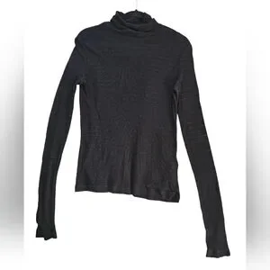 Lightweight sheer knit top with subtle horizontal stripe texture. Long sleeves and a relaxed crew neckline. Slightly cropped hem for modern fit. Easy black color layers well over camisoles.
