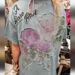 Beautiful blue t-shirt dress crafted from an amazingly soft, drapey fabric of 100% cotton that feels as good as it looks. Romantic roses and fluttering butterflies mingle with distressed cameos across the front and back, giving it that perfectly worn in feel. Designed with short sleeves and an easy, relaxed silhouette, this one size favorite truly works for everyone. Slip it on and go...timeless and endlessly wearable. Very Avant Garde piece! And handmade!
