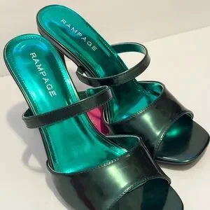 Chic Rampage heeled sandals with a glossy metallic teal upper. Double strap secures the foot. Sleek open-toe design for a polished look. Ideal for nights out or dressy events.