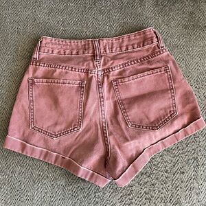High-rise jean shorts with a soft mauve washed finish. Cuffed hem and classic five-pocket design. Lightweight denim for casual wear.