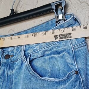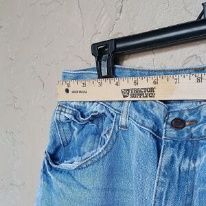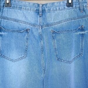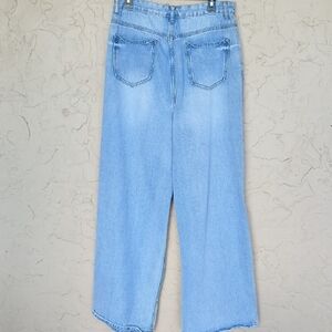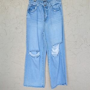 Light blue, wide-leg jeans with knee rips. High-rise silhouette and relaxed fit. Casual staple for everyday wear.