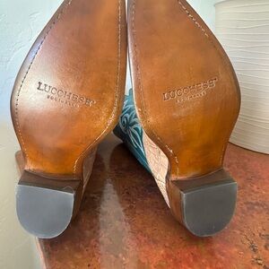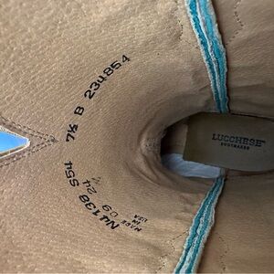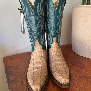 New in box - Lucchese cowboy boots with teal stitched trim.