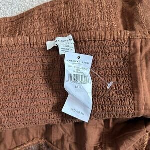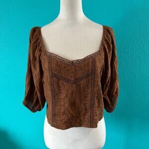 NWT American Eagle Brown Cropped Puff-Sleeve Smocked Blouse Top Size L