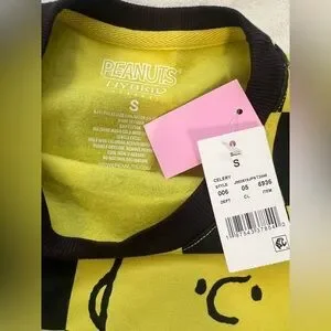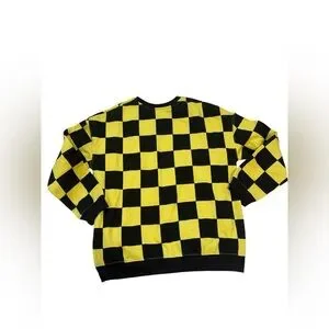 Bold yellow and black checkered sweatshirt featuring Charlie Brown and Snoopy graphic. Long sleeves with ribbed cuffs and hem. Soft casual pullover for everyday wear.