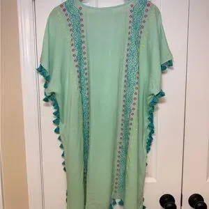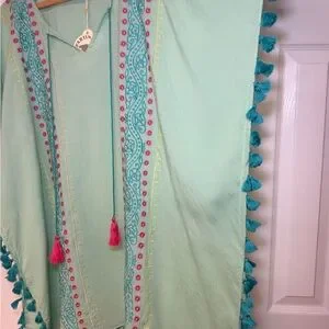 New with tags Spartina 449 aqua embroidered kaftan cover up featuring intricate pink and blue stitching with tassel accents and a braided tie neckline. Crafted in a lightweight viscose linen blend with a beautifully draped, flowy silhouette and wide sleeves for an elevated bohemian coastal feel. Designed as a luxe swim cover up or styled effortlessly as a statement tunic for resort wear and vacation looks.