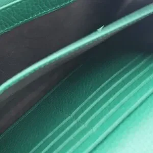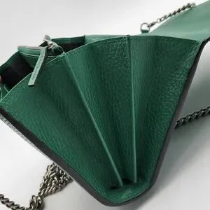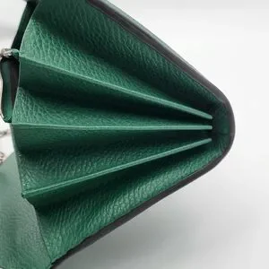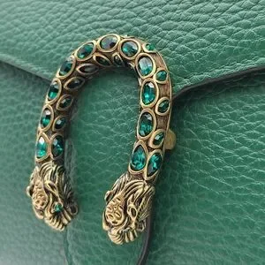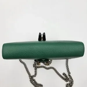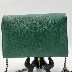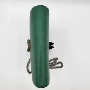 Structured green pebbled Calfskin leather crossbody. Features a decorative serpent head clasp with emerald accents. Polished silver-tone chain strap for shoulder or crossbody wear. Refined envelope silhouette for versatile styling. This bag is a A+ condition rate, NO Callouts..still like brand new, Stamp, code and heat stamp on pictures...